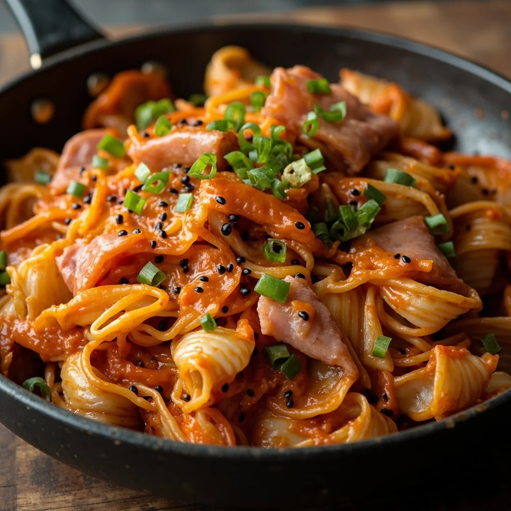 Ajouter le kimchi épicé dans le wok avec le jambon. Faire sauter vigoureusement pendant 2 minutes jusqu'à ce que le chou soit bien chaud et légèrement croustillant sur les bords.