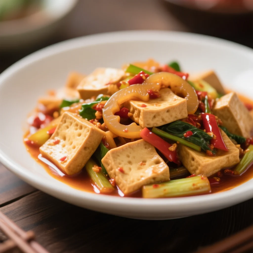 Un plat familial chinois rapide et savoureux, mettant en vedette le tofu konjac moelleux et le tofu séché salé, sauté avec des légumes croquants dans une sauce épicée. Prêt en moins de 30 minutes.