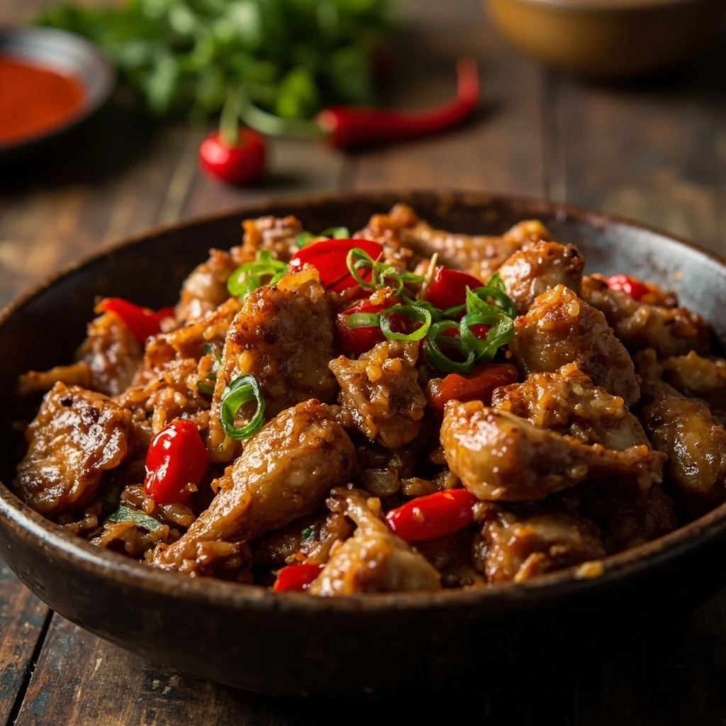 Un sauté audacieux présentant des morceaux de caille taillés en bouchées, rapidement frits jusqu'à ce qu'ils soient dorés, puis mélangés avec des épices parfumées, du gingembre frais et des piments rouges ardents. La méthode à haute chaleur crée une croûte extrêmement croustillante tout en gardant la viande tendre et juteuse.