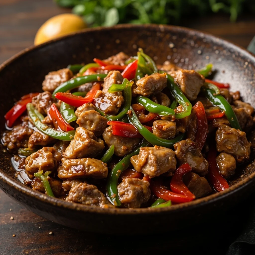 Un favori rapide pour les soirs de semaine avec de l'épaule de porc tendre sautée rapidement avec des piments verts frais. Le porc mariné développe une belle extérieur caramélisé tout en restant juteux à l'intérieur, équilibré par la chaleur vive et douce des poivrons.