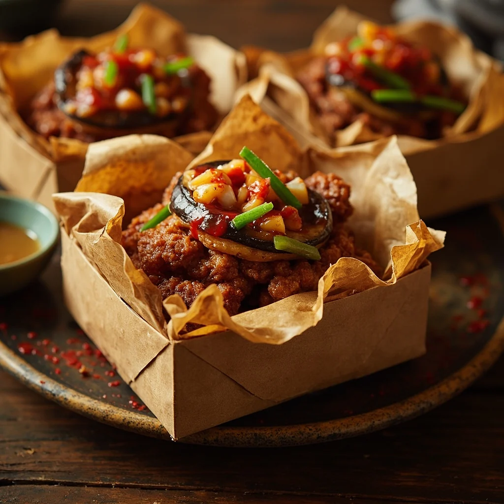 Verser la sauce épicée sur les boîtes d'aubergines chaudes ou servir à côté pour tremper. Garnir avec des oignons verts supplémentaires si désiré. Manger immédiatement pendant qu'elles sont croustillantes.