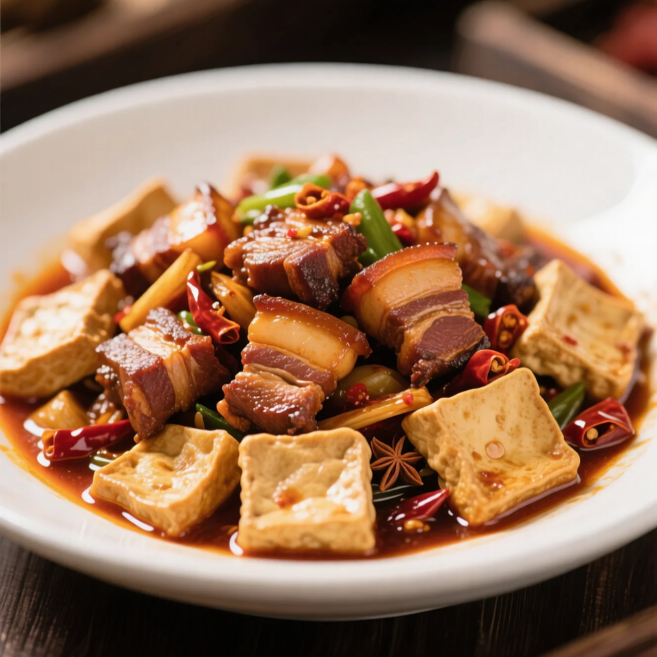 Ce plat, connu sous le nom de Xiang Gan Huiguo Rou, est une variante du célèbre Porc aux Deux Cuissons. En remplaçant le chou habituel par du tofu séché (xiang gan), le plat gagne une texture moelleuse satisfaisante qui absorbe parfaitement le riche gras de porc fondu.