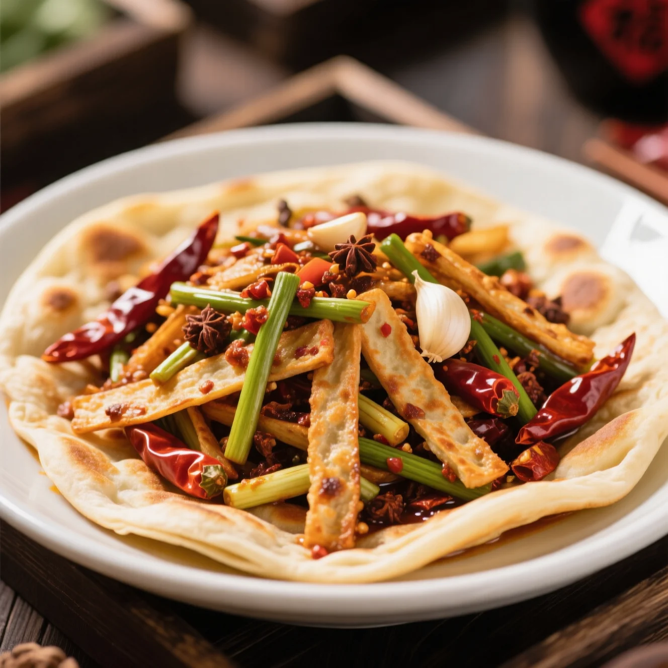 Un plat rustique de style de la rue du nord de la Chine mettant en vedette des lanières de pain plat moelleuses mélangées avec des épices aromatiques, des piments séchés et des tiges d'ail fraîches. Simple à faire et profondément satisfaisant.