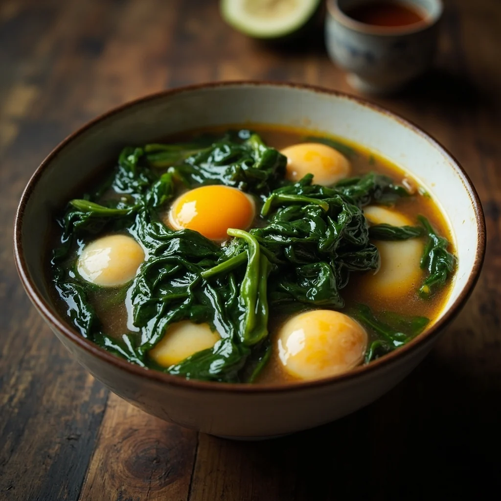 Assaisonner le bouillon avec du sel et une petite pincée de poivre blanc. Verser cuidadosamente le bouillon chaud et les morceaux d'œufs conservés sur les épinards blanchis. Arroser d'un peu d'huile de sésame si désiré. Servir immédiatement bien chaud.