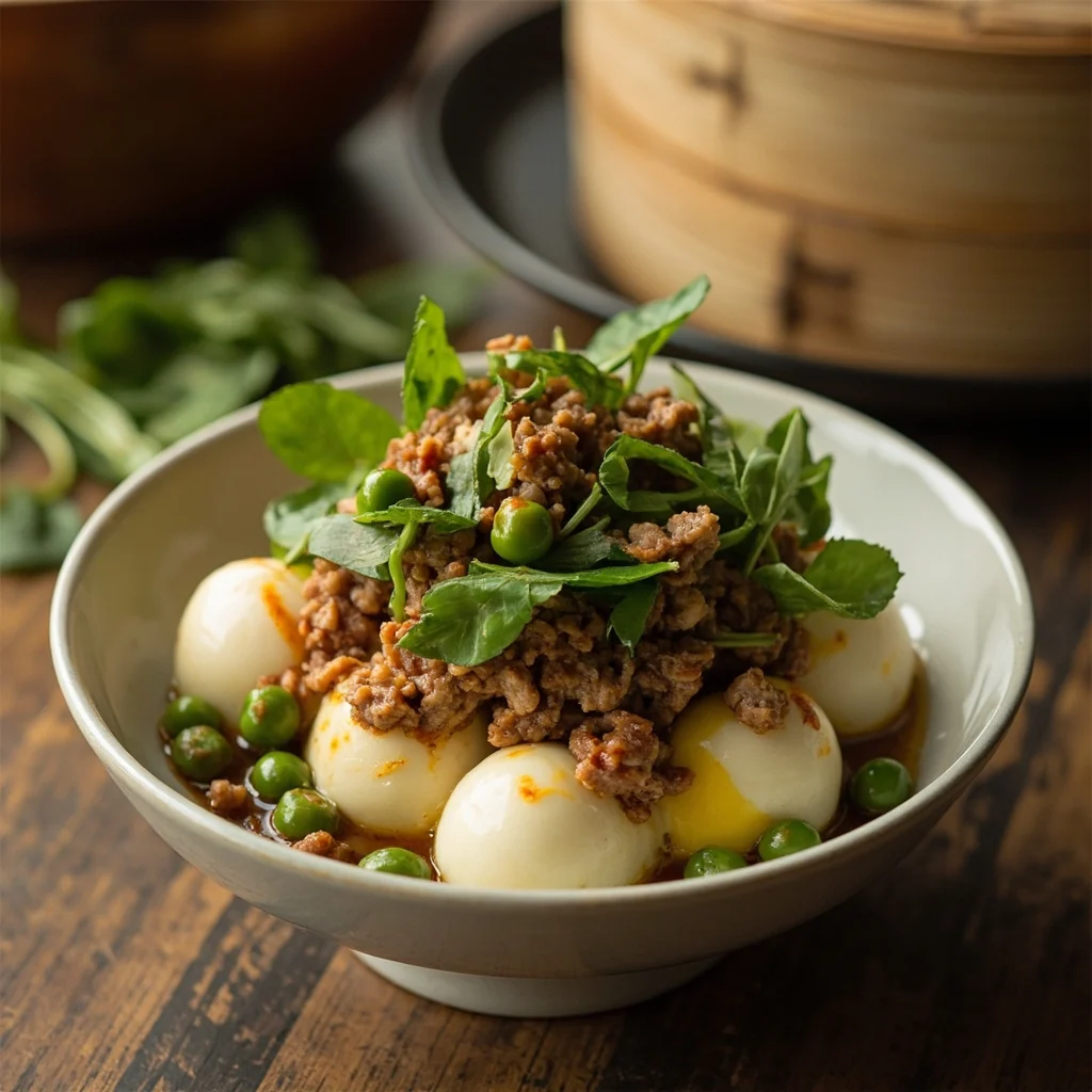 Versez le mélange de porc assaisonné sur les tranches de tofu, en l'étalant uniformément. Répartissez les petits pois surgelés sur le dessus. Placez le plat dans un steamer et faites cuire à feu moyen-élevé pendant 12-15 minutes jusqu'à ce que le porc soit cuit.