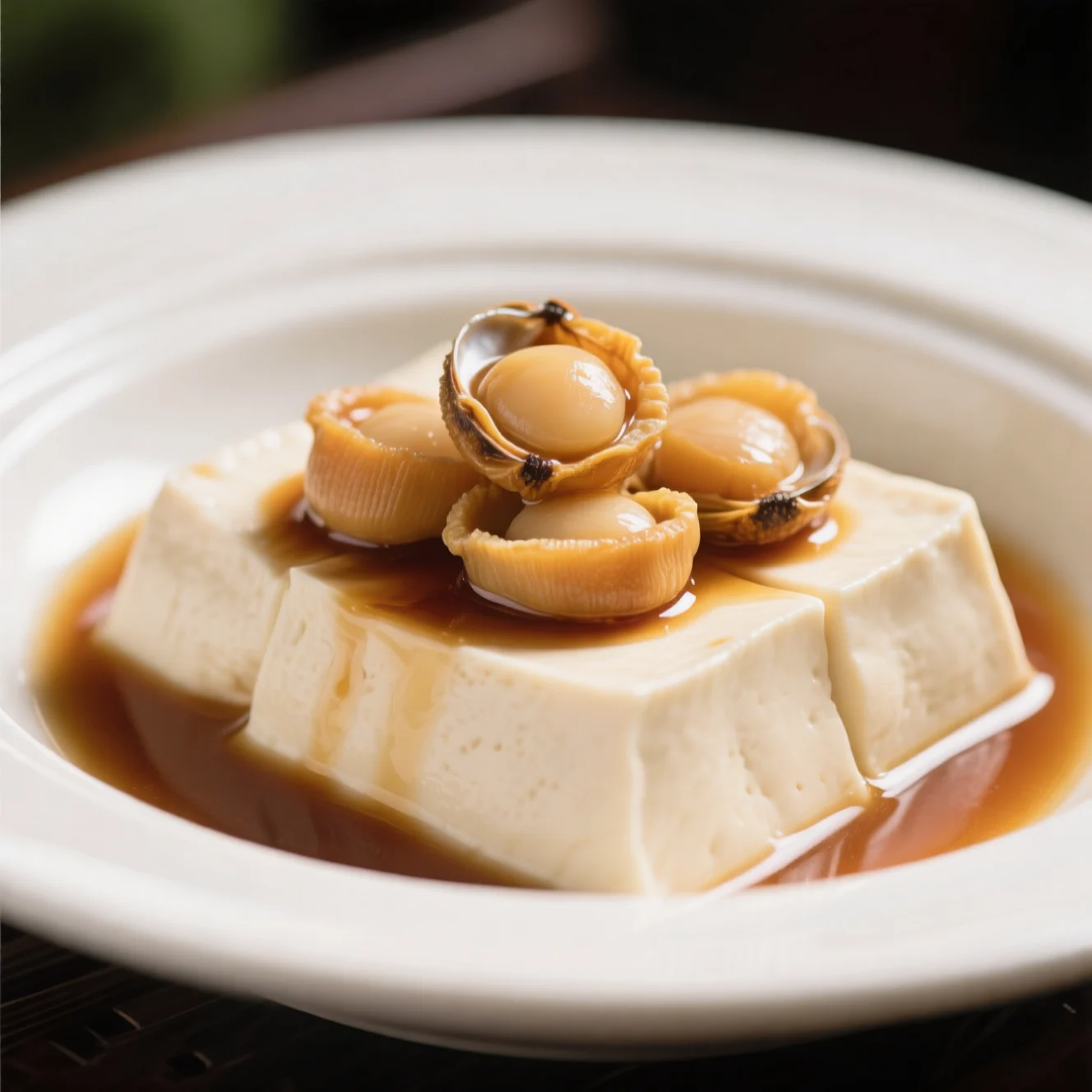 Dans un petit bol, mélangez la sauce soja aux fruits de mer et la sauce aux huîtres. Ajoutez 3 à 4 cuillères à soupe de l'eau de trempage des pétoncles réservée pour créer une vinaigrette savoureuse. Versez ce mélange sur le tofu et les pétoncles. Faites cuire le plat à la vapeur à feu vif pendant 8 à 10 minutes jusqu'à ce que le tofu soit chaud. Garnissez d'oignons verts hachés avant de servir.