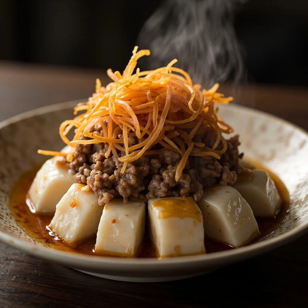 Répartissez uniformément le mélange de porc sur les tranches de tofu. Placez l'assiette dans un steamer et faites cuire à la vapeur à feu vif pendant 8-10 minutes jusqu'à ce que le tofu soit réchauffé et ait absorbé les saveurs savoureuses. Retirez du steamer, arrosez d'huile de sésame et garnissez d'oignons verts hachés. Servez immédiatement sur du riz vapeur.