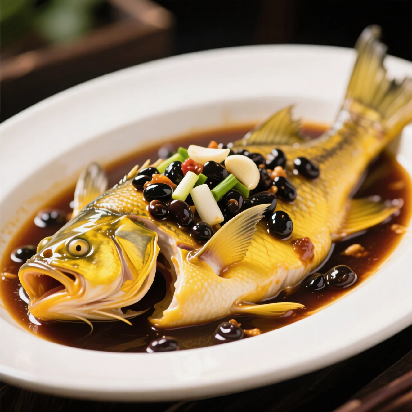 Poisson-chat jaune tendre cuit à la perfection à la vapeur avec un mélange savoureux et aromatique de haricots noirs fermentés, d'ail et d'oignons verts.