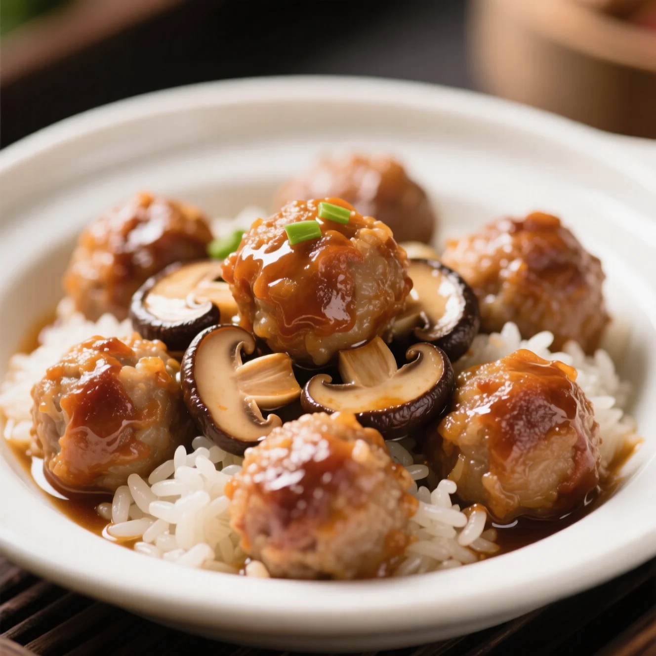 Boulettes de porc juteuses marinées toute la nuit, cuites à la vapeur avec des champignons et enrobées de riz gluant pour une texture moelleuse et savoureuse.