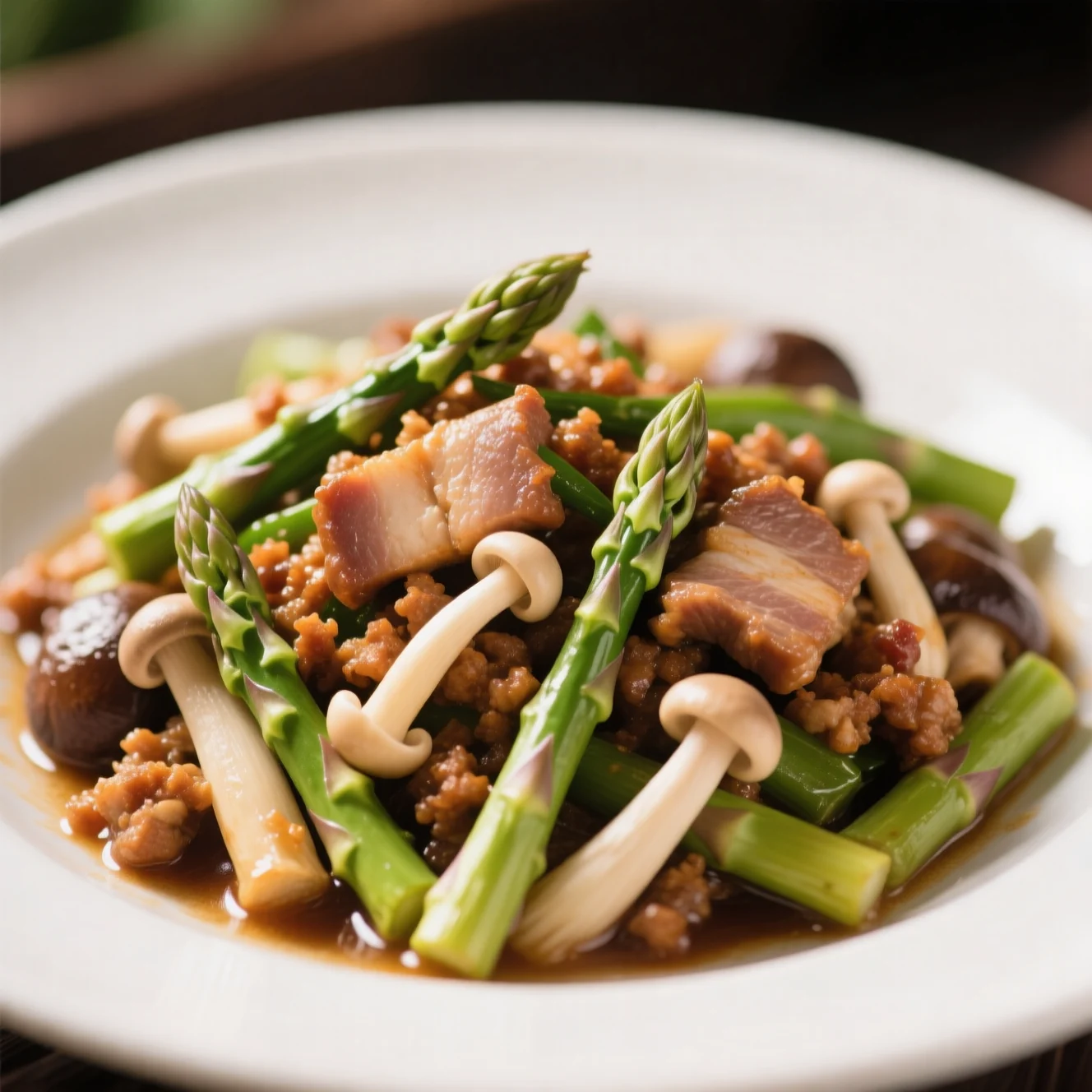 Un sauté rapide et savoureux mettant en vedette des asperges tendres, des pleurotes enoki délicats et du porc haché aromatique.