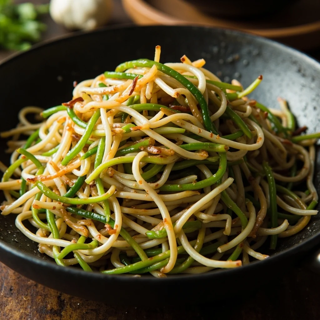 Un accompagnement rapide et aromatique mettant en vedette des germes de haricots croquants et des tiges d'ail vert parfumées, sautées au wok jusqu'à ce qu'elles flétrissent à peine. La douceur délicate des germes se marie magnifiquement avec les notes subtiles d'ail.