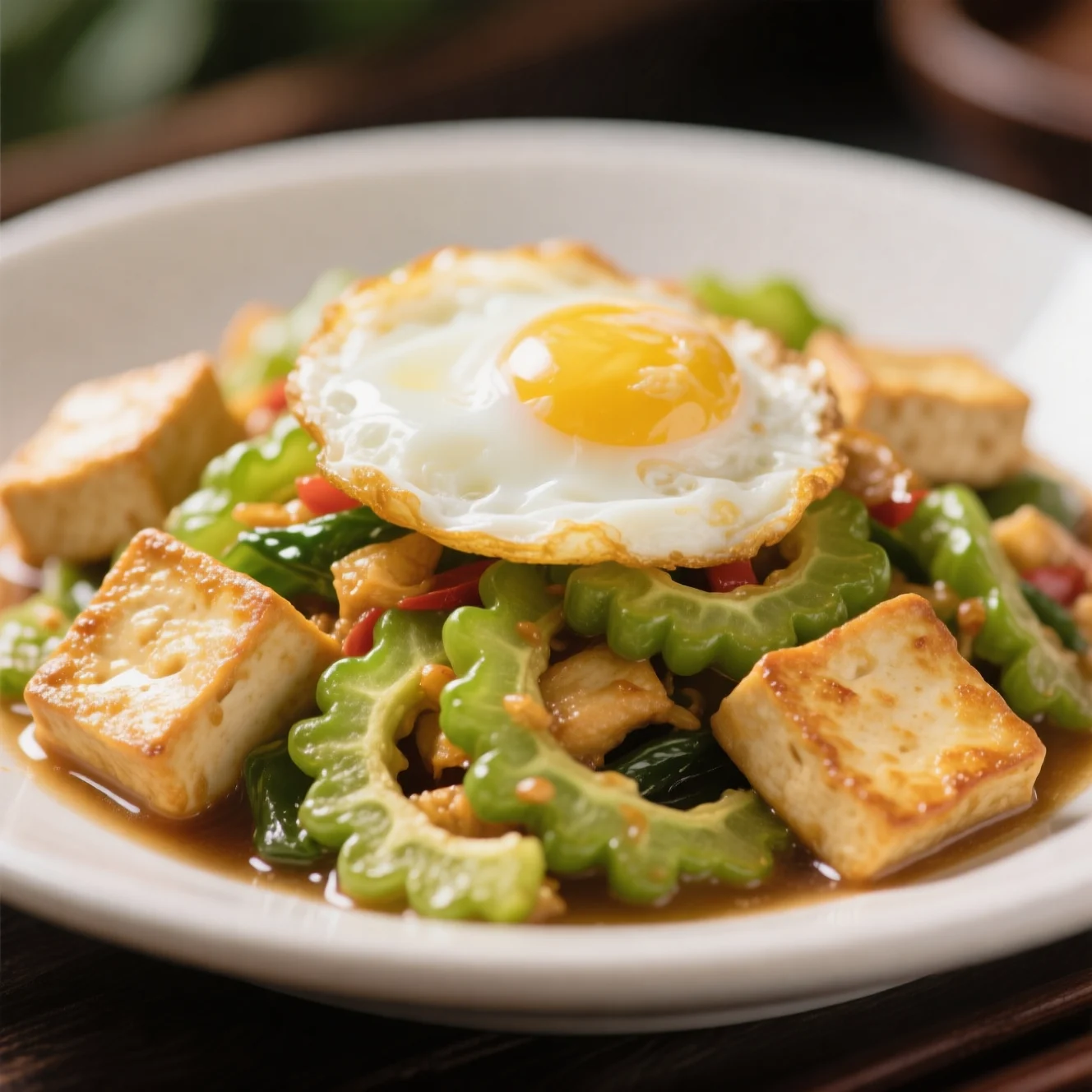 Un sauté savoureux et sain mettant en vedette du melon amer croustillant, du tofu doré poêlé et une légère couche d'œuf. Ce plat équilibre l'amertume naturelle du melon avec des notes salées.