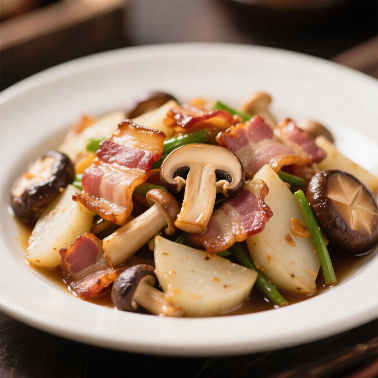 Un sauté rapide et savoureux à la maison, composé de tranches tendres de chinois à la vapeur, accompagnées de bacon fumé et de champignons pleurotes en huître charnus. Ce plat se prépare en moins de 20 minutes et constitue un accompagnement satisfaisant pour un repas de semaine ou un plat léger.