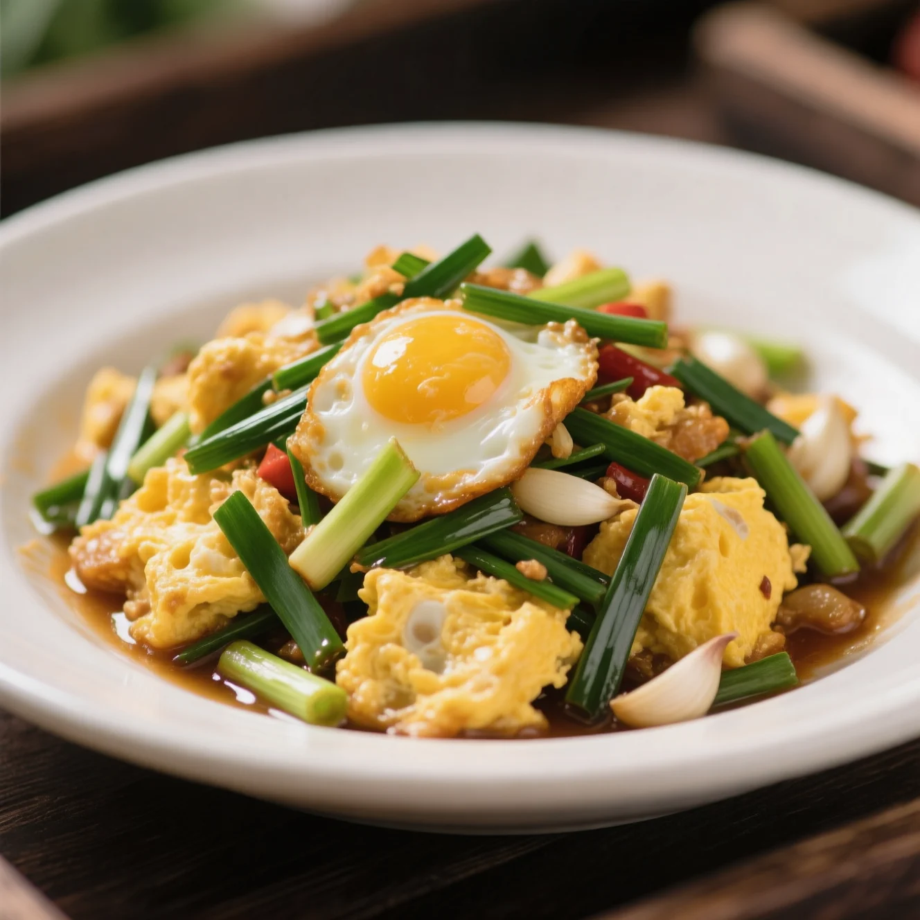 Cette poêlée simple met en valeur la saveur piquante et analogue à l'oignon de la ciboule (souvent appelée 'Jiu Wang'). En cuisinant les œufs séparément d'abord, ils conservent une texture moelleuse qui contraste magnifiquement avec les ciboules croquantes-tendres.