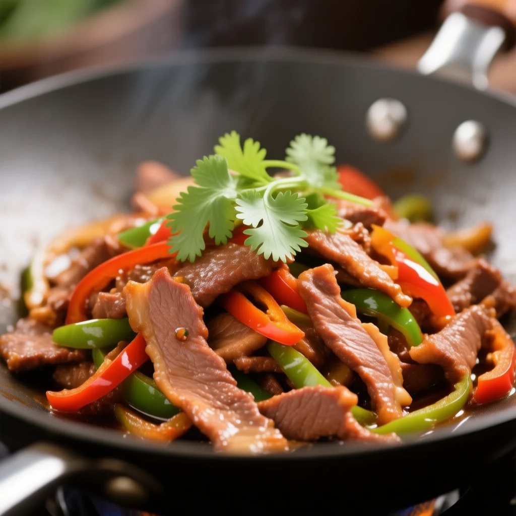 Des tendres lamelles de viande de cerf sont rapidement sautées avec des poivrons aromatiques et de la coriandre fraîche dans ce plat chinois rapide et savoureux. La viande est marinée pour préserver l'humidité, puis cuite à feu vif pour un résultat délicieusement relevé.
