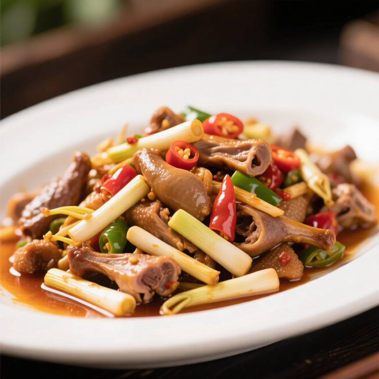 Un sauté épicé et savoureux mettant en vedette des abats de canard tendres, des pousses d'ail croquantes et des piments colorés.