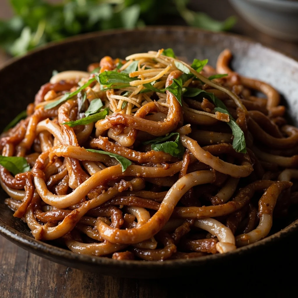 Ce classique de la cuisine familiale transforme des ingrédients simples en quelque chose de spectaculaire. La clé est d'avoir vos intestins de canard déjà braisés et prêts à l'emploi—si vous ne trouvez pas de version pré-faite, faites-les d'abord bouillir jusqu'à ce qu'ils soient tendres, puis marinez-les dans de la sauce soja et des épices.