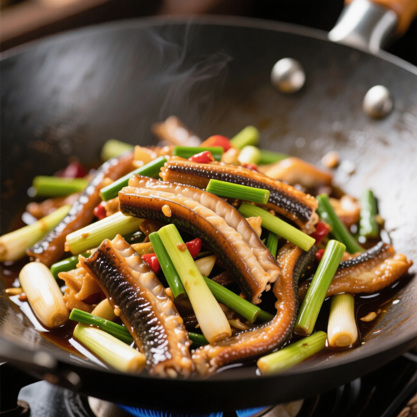Ce stir-fry classique de la région Jiangsu-Zhejiang met en valeur l'équilibre délicat des saveurs caractéristique de la cuisine Jiangzhe. La clé est une chaleur élevée et une cuisson rapide pour garder l'anguille tendre et les pousses d'ail croustillantes.