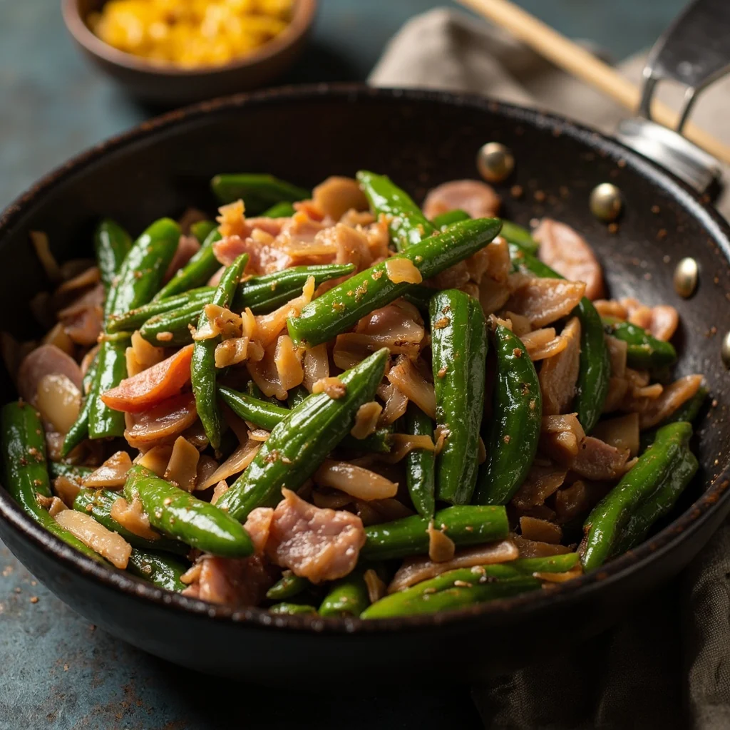 Ce sauté rapide met à l'honneur la texture unique des gombos associée à la saveur relevée du jambon. Le secret est de garder les gombos tendres mais croquants—une cuisson excessive les rendrait pâteux. Servez directement de la poêle sur du riz vapeur.