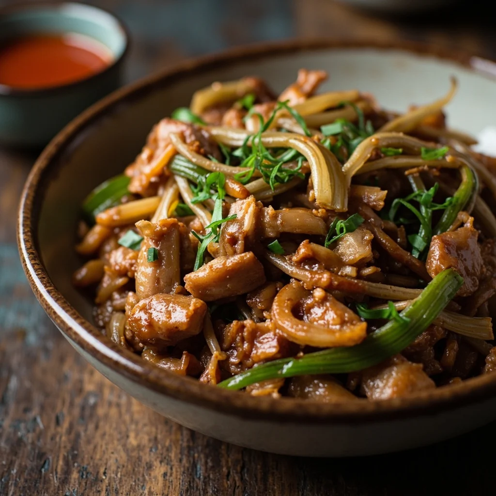 Ce plat est un classique de la cuisine familiale chinoise, où la douceur légère du porc rencontre la saveur piquante et fraîche des tiges d'ail. La clé est une chaleur élevée et une cuisson rapide pour garder les légumes croustillants et la viande tendre.