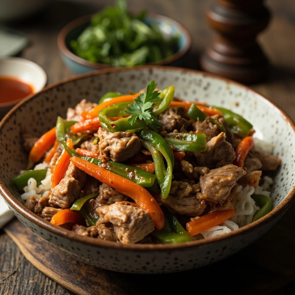 Ce sauté chinois classique associe le porc savoureux au croquant sucré des poivrons. Les champignons noirs ajoutent une texture satisfaisante, tandis que la sauce soja lie toutes les saveurs harmonieusement.