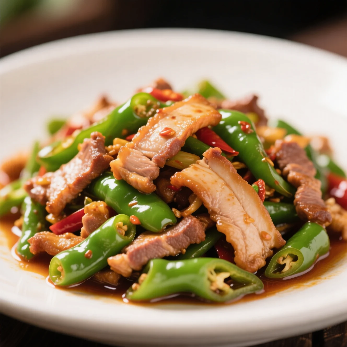 Un sauté rapide et savoureux style Sichuan, mettant en vedette des lanières de porc tendres accompagnées de poivrons verts croustillants et légèrement épicés. Ce plat se prépare en quelques minutes et offre un équilibre satisfaisant entre saveurs salées et chaleur douce.