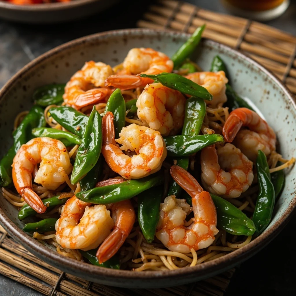 Un stir-fry rapide et vibrant avec des crevettes tendres et des pois mange-tout croquants, parfait pour un dîner léger en semaine.