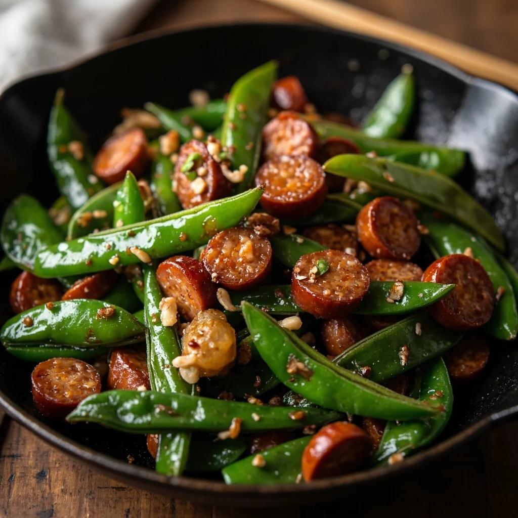 Ce plat classique chinois familial combine la texture fraîche et croustillante des pois mange-tout avec la riche saveur sucrée-salée de la saucisse chinoise. Le secret est de garder les pois mange-tout légèrement croustillants et de ne pas trop les cuire.