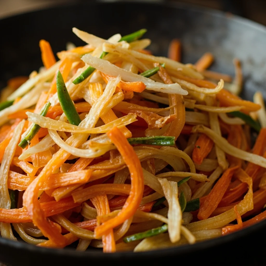 Un classique chinois coloré avec des rubans de carottes tendres-croquants et de champignon noir séché sautés avec des œufs moelleux. Ce stir-fry rapide offre un contraste de texture satisfaisant en moins de 20 minutes.