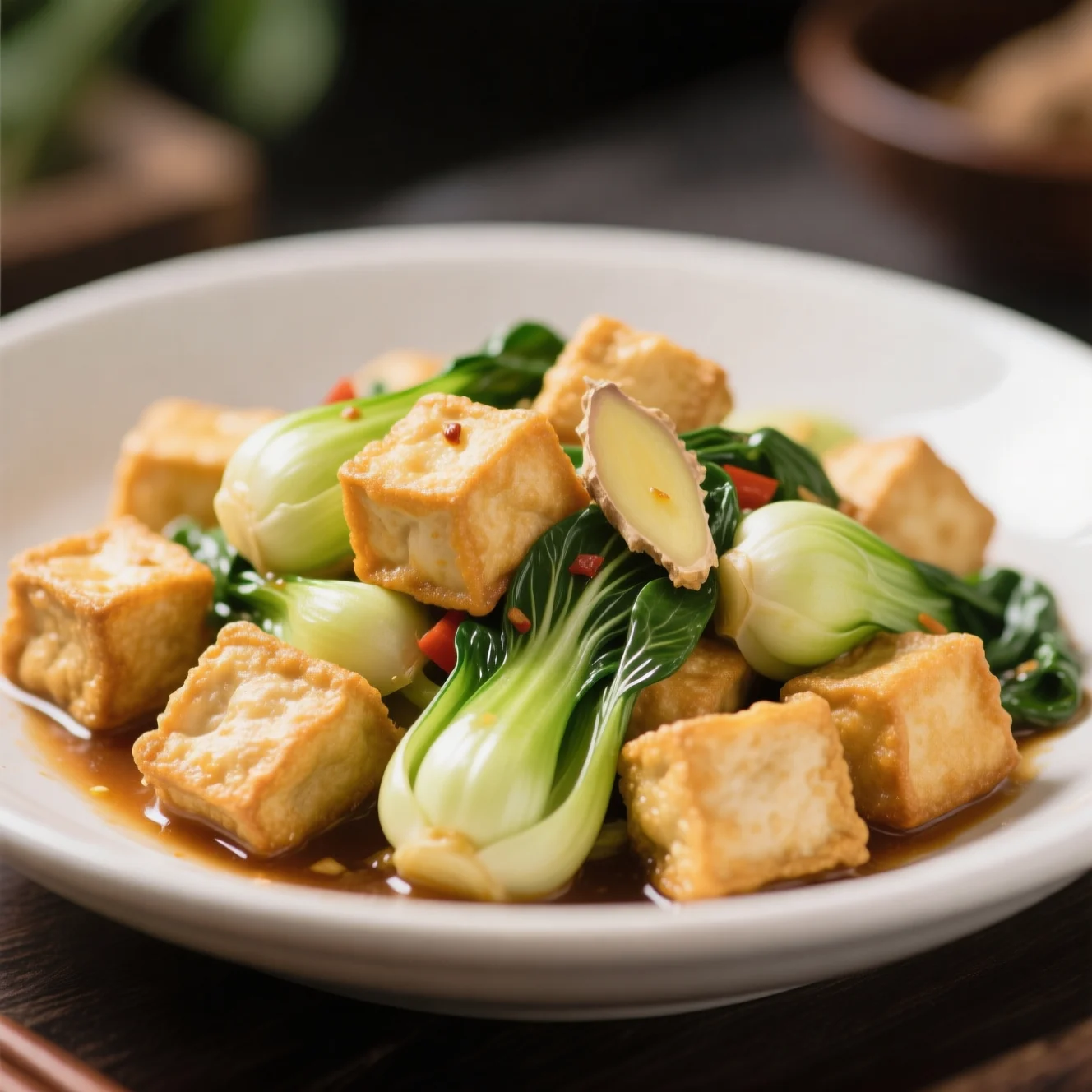Un plat végétarien rapide et sain mettant en vedette des pousses de tofu croustillantes et du bok choy frais, légèrement assaisonné au gingembre.