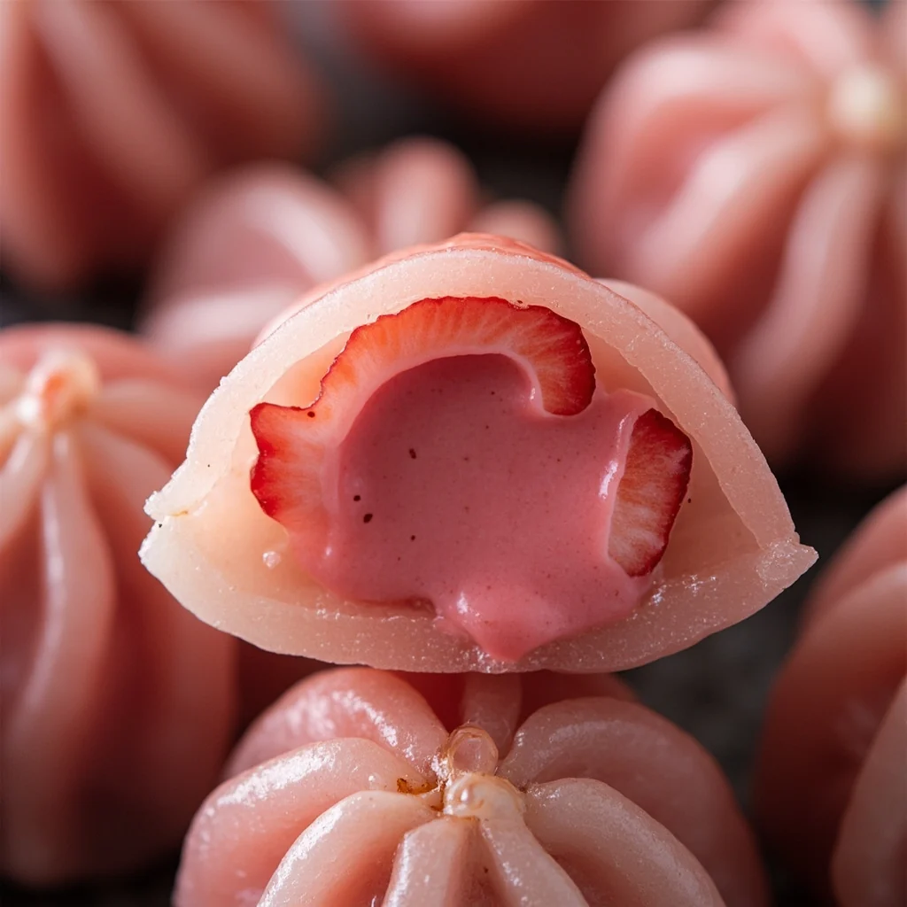 Diviser la pâte en 12 morceaux égaux. Aplatir chaque morceau dans la paume de la main, ajouter une petite cuillère de farce à la fraise au centre, puis pincer pour fermer et rouler en une boulette lisse. Saupoudrer légèrement de fécule de maïs pour éviter qu'elles ne collent.