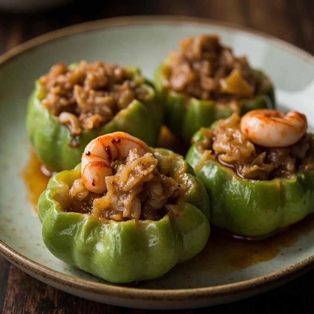 Des rounds de melon amer tendres farcis d'un mélange savoureux de porc et de crevettes, puis mijotés doucement dans une sauce savoureuse. Un plat Hakka classique qui équilibre l'amertume naturelle du melon avec une farce riche et juteuse.