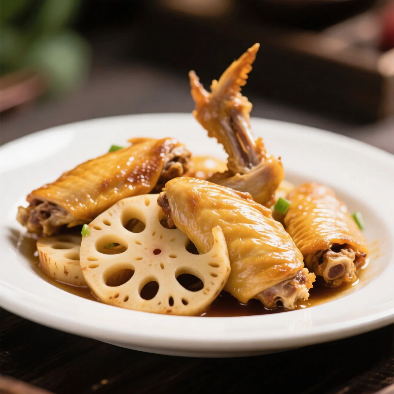 Assaisonnez les ailes désossées à l'intérieur et à l'extérieur avec du sel, du poivre blanc et un filet de vin de cuisine. Faricissez 2-3 rubans de racine de lotus dans chaque poche d'aile. La racine de lotus doit remplir la cavité sans être forcée.