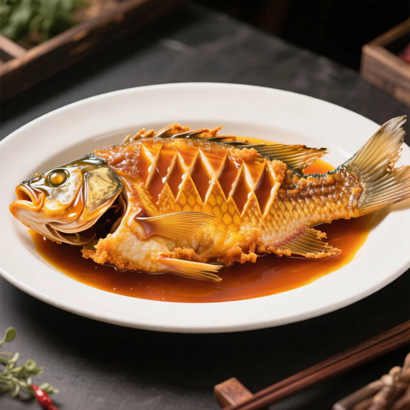 Versez la sauce chaude sur la carpe frite immédiatement. Garnissez d'oignons verts et servez tout de suite pendant que la sauce est brillante et le poisson encore croustillant.