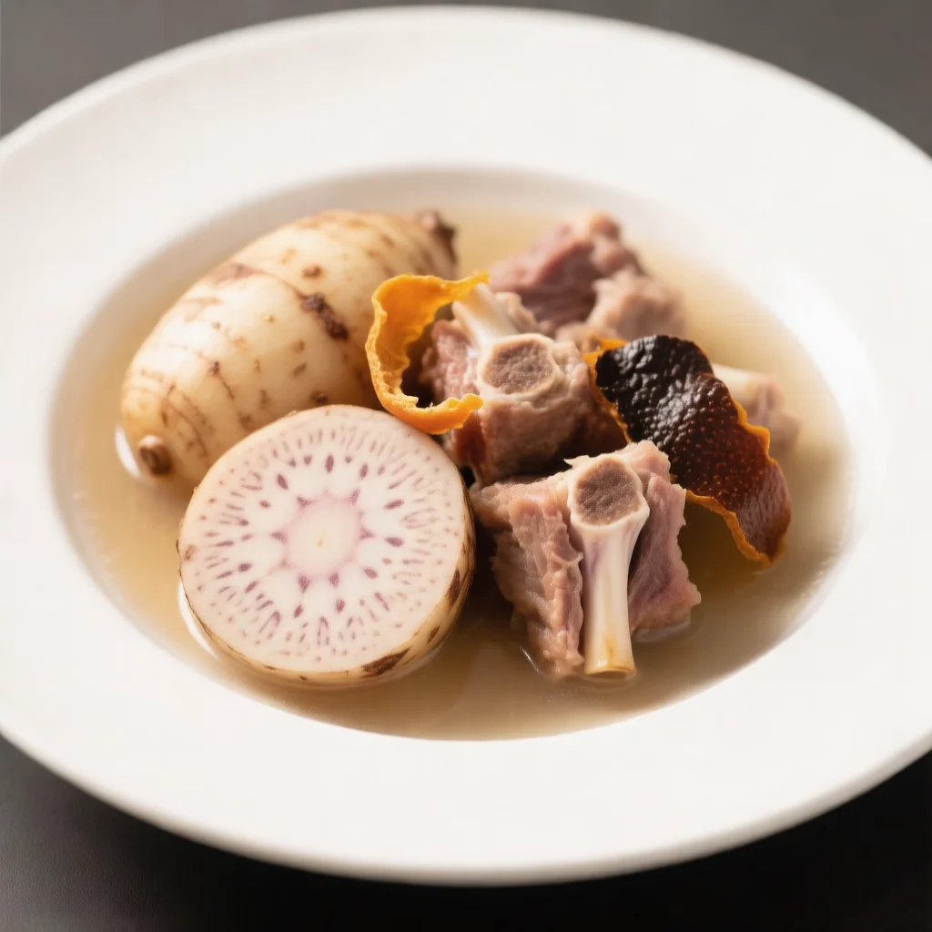 Ce ragoût simple laisse frémir les côtes de porc avec du zeste de mandarine séché jusqu'à ce que la viande soit tendre, puis ajoute des morceaux de taro à cuire jusqu'à ce qu'ils soient mous. Le résultat est une soupe chaude et familiale avec un arôme d'agrumes subtil et une texture riche et réconfortante.