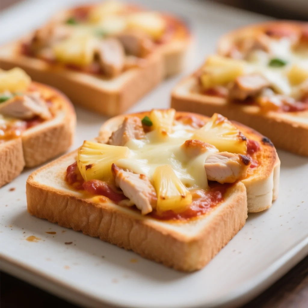 Répartir les morceaux de poulet hachés sur le pain sauce. Ajouter les morceaux d'ananas coupés en dés par-dessus. Parsemer généreusement de fromage mozzarella râpé sur le tout.