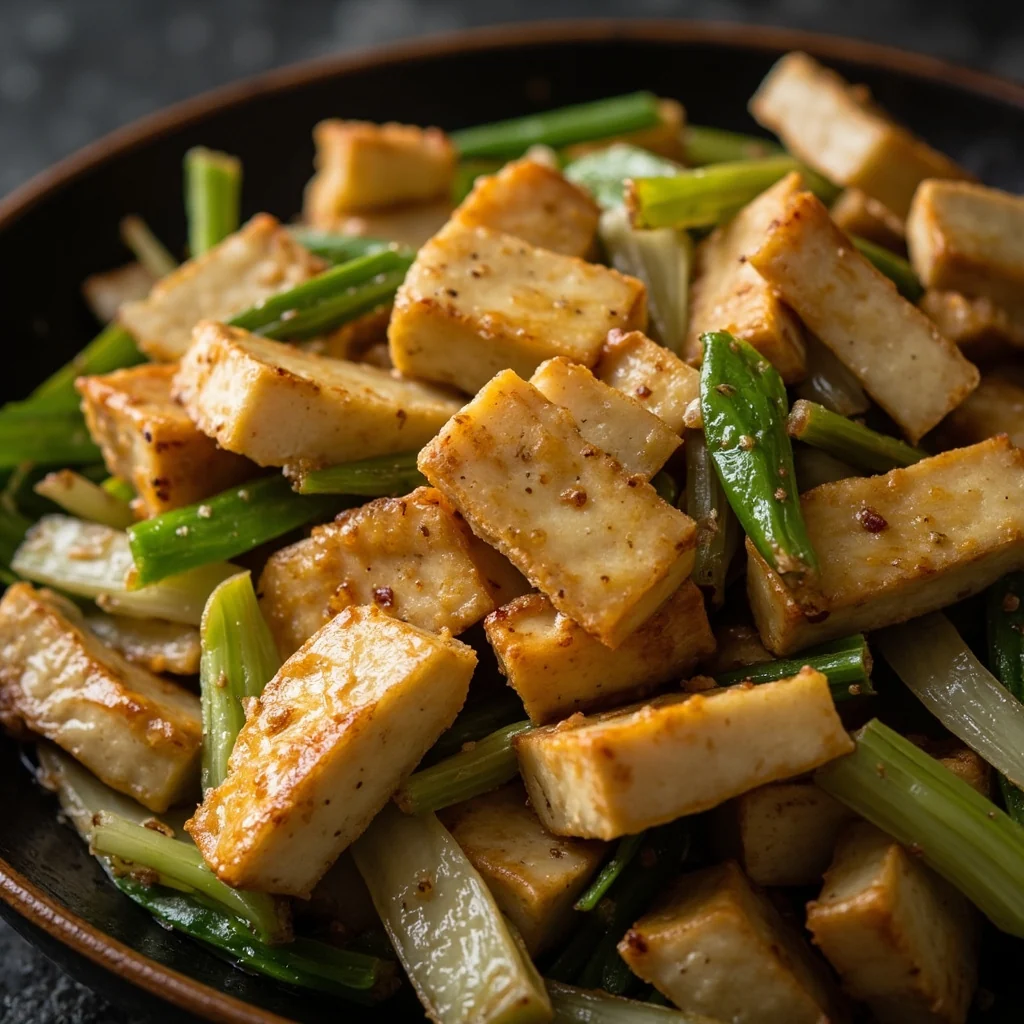 Un plat de cuisine chinoise familiale rapide et savoureux, alliant des lanières de tofu soyeux à du céleri croquant. Les légumes libèrent de l'humidité pendant la cuisson, qui s'évapore pour créer une texture délicieuse et légèrement croustillante.