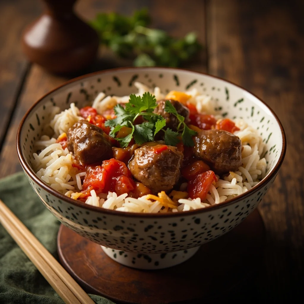 Ce plat familial associe la brillance sucrée-acidulée des tomates mûres au bœuf savoureux, créant un repas réconfortant où le riz devient le véhicule parfait pour tous ces délicieux jus.