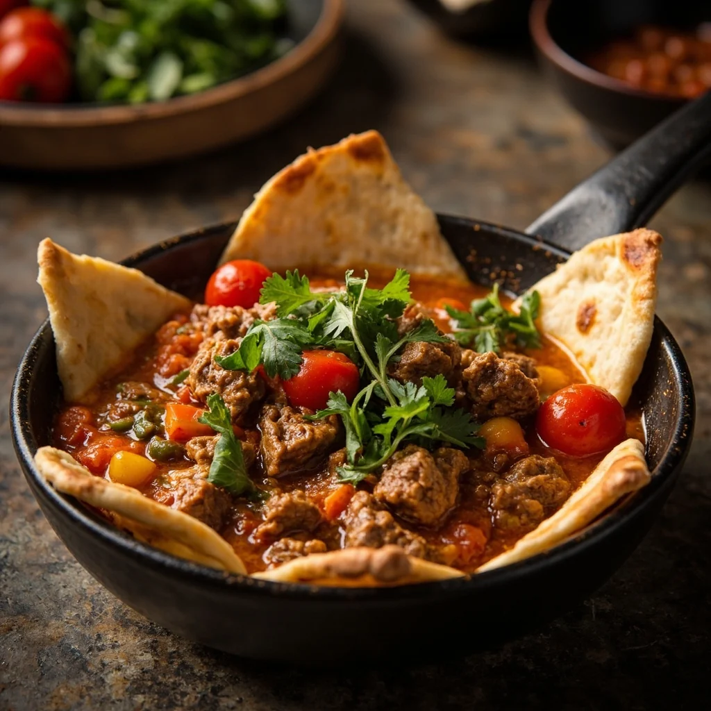 Versez les morceaux de pain plat dans la casserole et appuyez-les dans le bouillon. Laissez-les mijoter en les retournant une ou deux fois jusqu'à ce qu'ils s'attendrissent et absorbent la sauce tomate—environ 3-4 minutes.