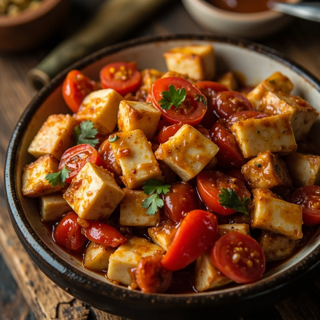 Cette association classique réunit la texture délicate et crémeuse du tofu avec l'acidité légèrement sucrée des tomates mûres. C'est un plat de cuisine familiale bien-aimé qui démontre que des ingrédients simples peuvent créer quelque chose de vraiment délicieux lorsqu'ils sont bien préparés.