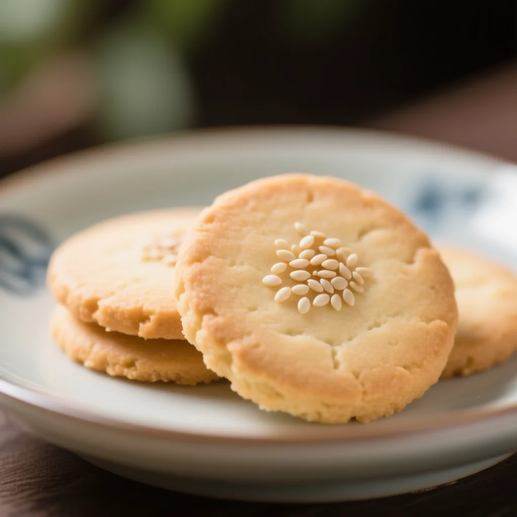 Ces biscuits sablés dorés sont pressés avec une empreinte de pouce au centre avant la cuisson, créant la caractéristique 凹痕 qui retient les graines de sésame. La pâte se prépare en quelques minutes et ne nécessite pas de temps de repos au réfrigérateur.