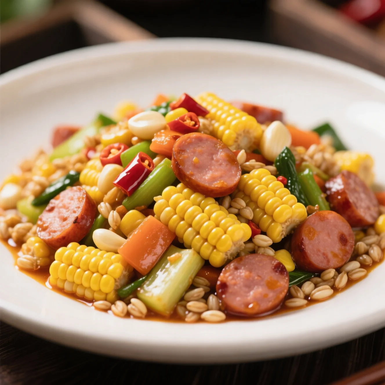 Un sauté coloré et nutritif avec du maïs sucré, de la saucisse savoureuse et de l'orge saine, mélangé avec des légumes croquants dans une huile parfumée à l'ail et au piment.