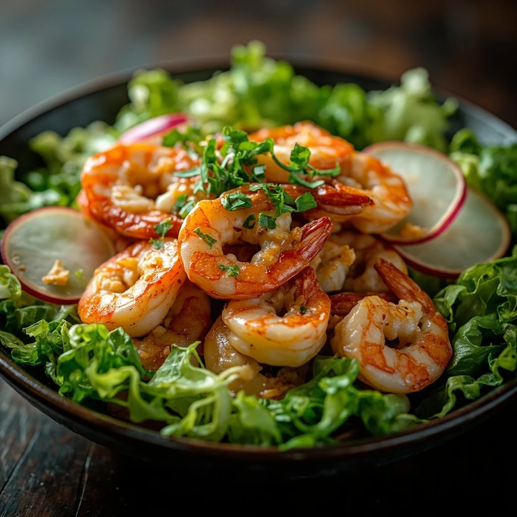 Un sauté au wok chinois visuellement époustouflant mettant en vedette des crevettes tendres associées à des légumes verts croquants. Les crevettes sont rapidement sautées au wok avec de la laitue fraîche et du radis doux, créant un beau plat aux textures et couleurs contrastées.