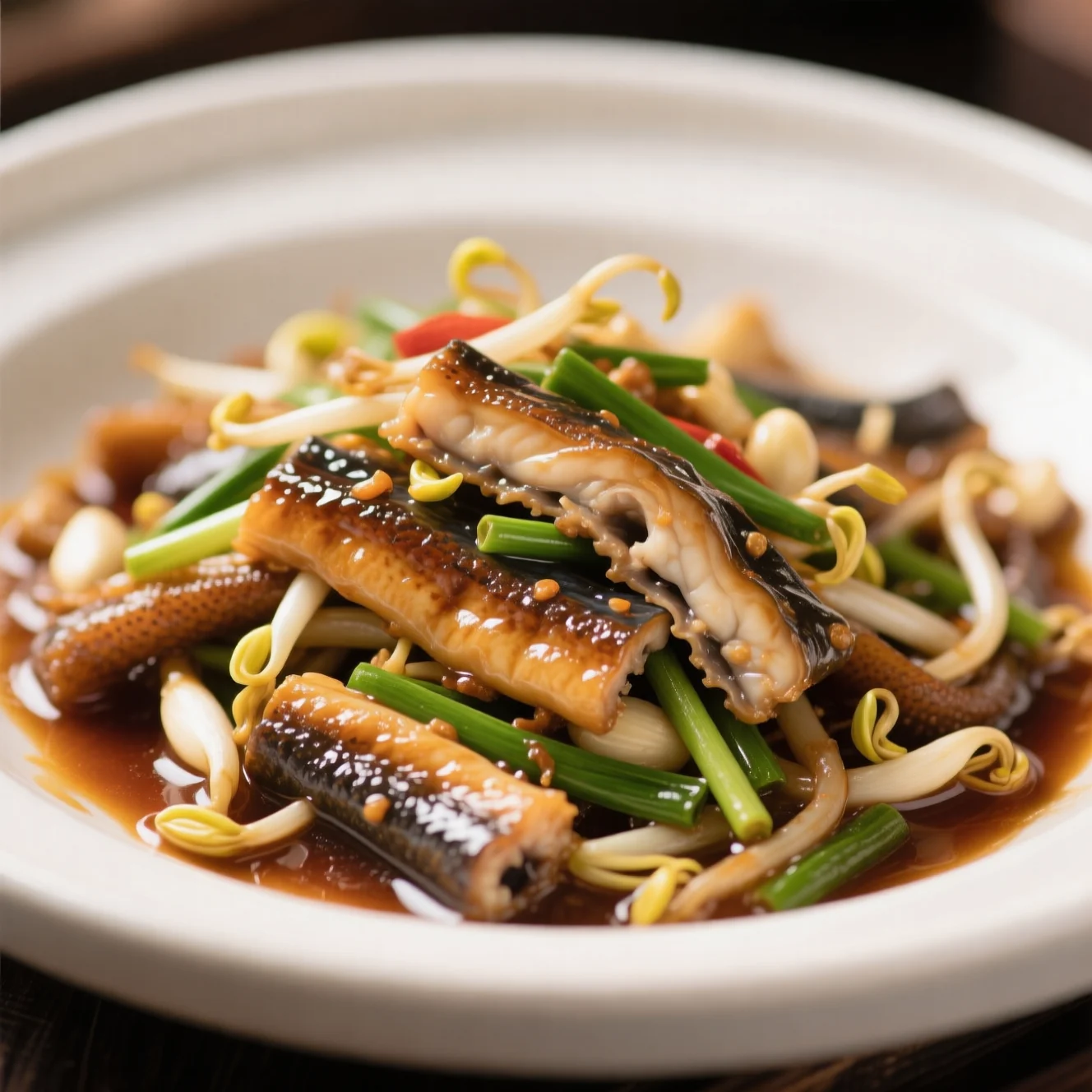 淡水ウナギの柔らかい身を、香ばしいソースで風味豊かなニンニク芽と一緒に素早く炒めた经典的な料理です。ウナギの独特の舌触りと緑のニンニクの辛いさくさくとした食感が特徴的な一品です。