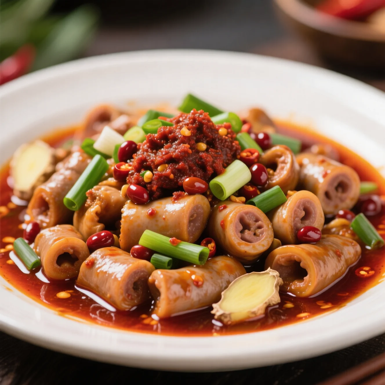 Tender pork intestines braised in a bold, aromatic chili sauce with green onions and ginger. A beloved Sichuan street food turned home-cooked favorite.