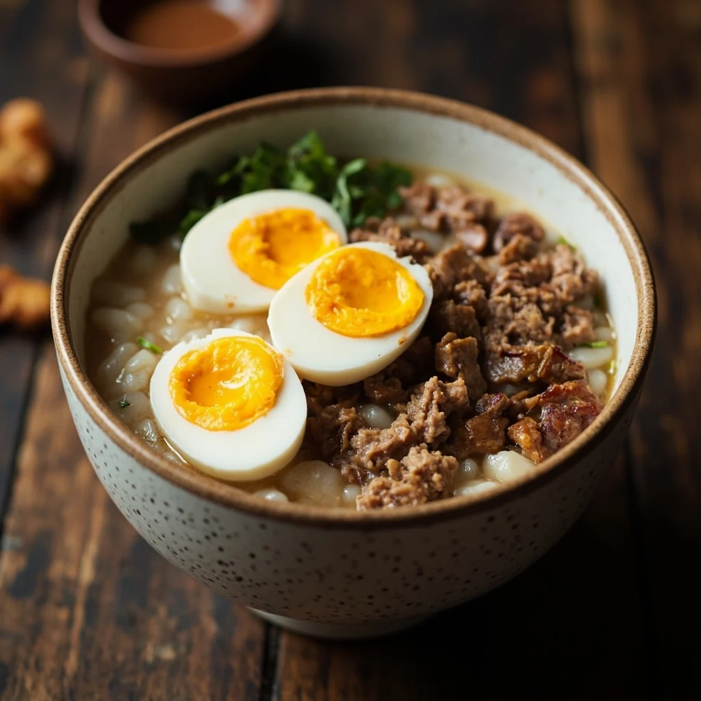 A soothing Chinese rice porridge featuring silky century eggs and savory ground pork. This dish rewards patience—the congee gently simmers for hours until it achieves a rich, creamy texture.