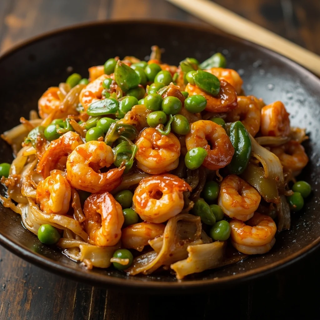 A vibrant stir-fry featuring tender shrimp, crunchy bamboo shoots, and sweet edamame tossed in a sweet-spicy Korean-inspired sauce. This colorful dish comes together quickly for a satisfying weeknight dinner.