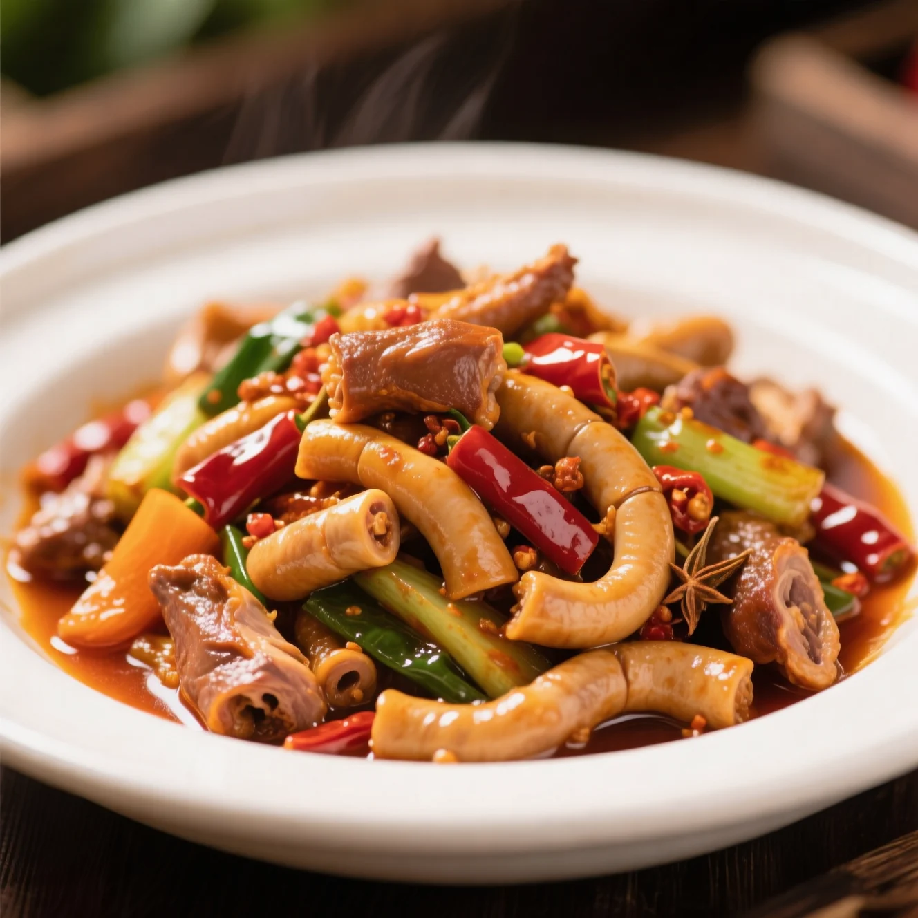 A sizzling, fiery home-style dish featuring tender duck intestines tossed with aromatic vegetables and bold spices.