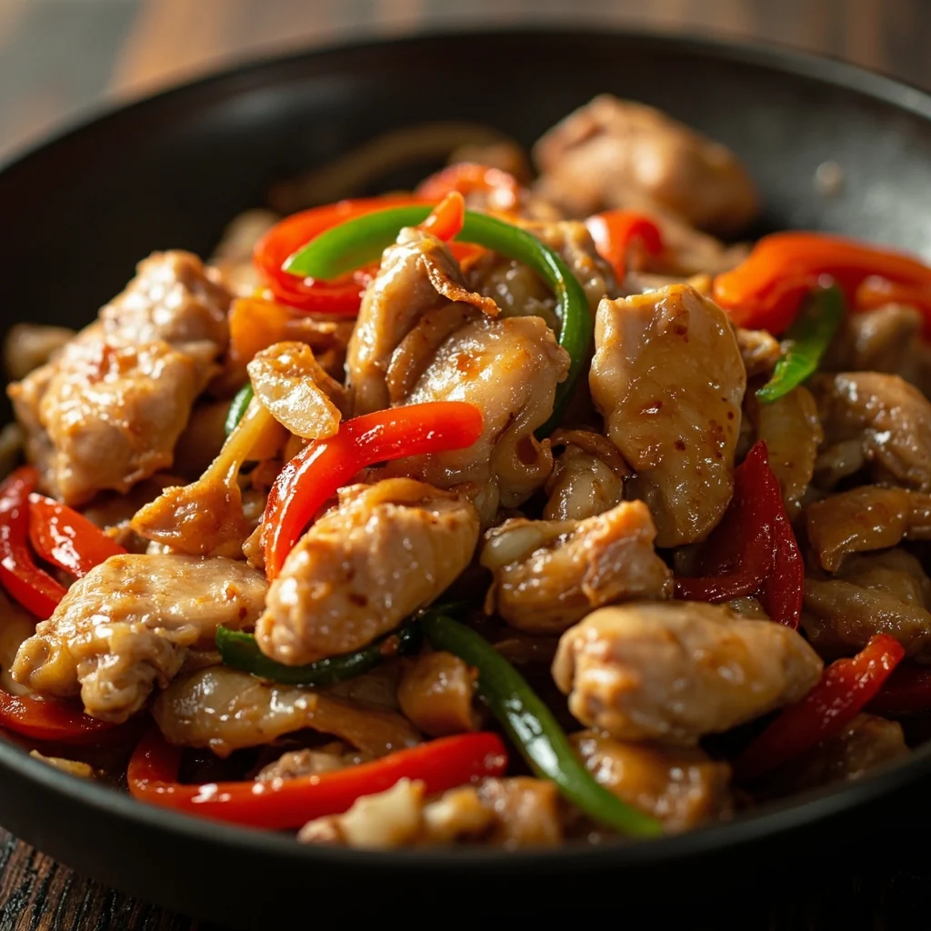 A weeknight stir-fry featuring caramelized chicken thighs and crisp-tender peppers glazed with savory soy and oyster sauce. High heat and quick timing keep every bite juicy and vibrant.