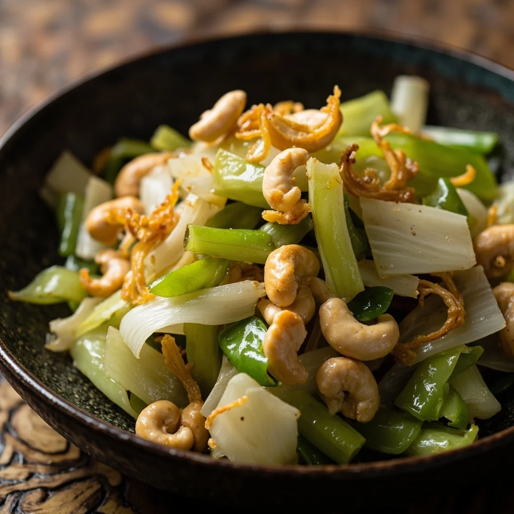 Лёгкое и хрустящее китайское блюдо стир-фрай, сочетающее нежный сельдерей, деликатные лепестки луковиц лилии и золотистые обжаренные кешью. Это быстрое блюдо прекрасно балансирует текстуры и вкусы.